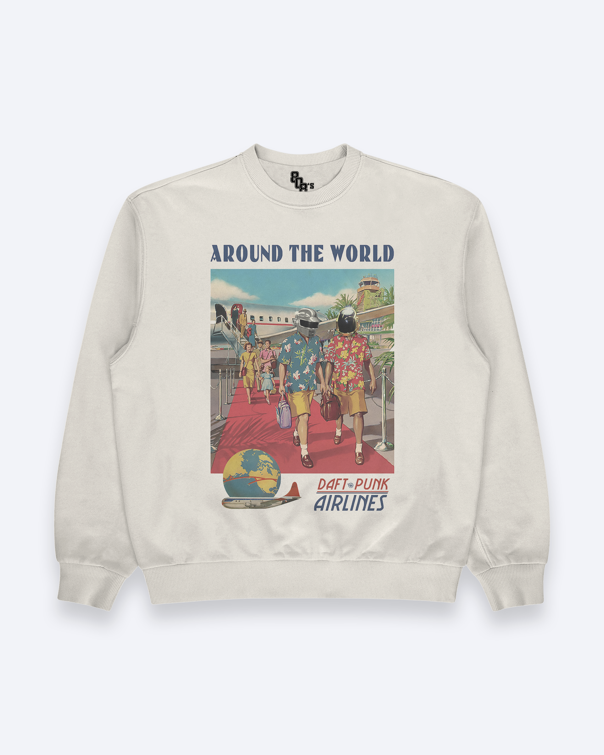 Inspired by Daft Punk's iconic electronic masterpiece "Around the World"—the 1997 dance anthem that became one of Billboard's "100 Best Dance Songs of All Time" and featured the hypnotic phrase repeated 144 times—this sweatshirt captures both musical nostalgia and the romanticism of vintage travel advertising.